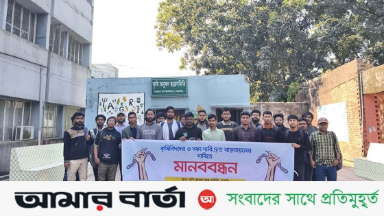 কৃষিবিদদের তিন দফা দাবি দ্রুত বাস্তবায়নের দাবিতে মানববন্ধন করেছে বাংলাদেশ কৃষি বিশ্ববিদ্যালয়ের (বাকৃবি) কৃষি অনুষদের শিক্ষার্থীরা।