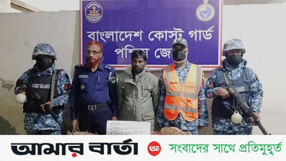 মোংলায় কোস্ট গার্ড ও পুলিশের যৌথ অভিযানে ৩২ কেজি হরিণের মাংস, মাথা, পা ও ফাঁদসহ ১ শিকারি আটক।