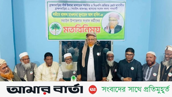 ব্রাহ্মণবাড়িয়ার সরাইলের সাংবাদিকদের সঙ্গে মতবিনিময় করেছেন ব্রাহ্মণবাড়িয়া-২ (সরাইল-আশুগঞ্জ ও বিজয়নগর একাংশ) আসনের বিএনপির জোটের মনোনীত সংসদ সদস্য পদপ্রার্থী জমিয়তে উলামায়ে ইসলাম বাংলাদেশ কেন্দ্রীয় কমিটির সহ-সভাপতি মাওলানা জুনায়েদ আল হাবিব।