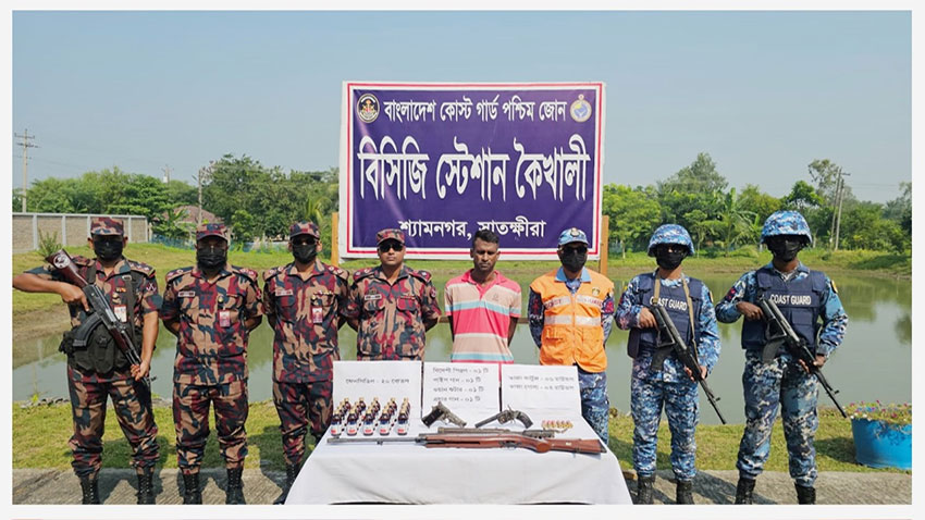 তিনি বলেন, নিজস্ব গোয়েন্দা তথ্যের ভিত্তিতে আজ ১১ নভেম্বর ২০২৫ তারিখ মঙ্গলবার রাত ২ টায় কোস্ট গার্ড স্টেশন কৈখালী কর্তৃক কৈখালীর ভেটখালী বাজার সংলগ্ন এলাকায় একটি যৌথ অভিযান পরিচালনা করা হয়। অভিযানের সময় কোস্টগার্ডের উপস্থিতি টের পেয়ে অস্ত্র ব্যবসায়ী বনের ভিতর পালানোর চেষ্টা করলে আভিযানিক দল ধাওয়া করে ১ টি একনলা বন্দুকসহ দুর্ধর্ষ সন্ত্রাসী, মানব পাচারকারী এবং ভারত থেকে অস্ত্র ও মাদক চোরাচালানকারী মামুন কয়ালকে আটক করে। পরবর্তীতে প্রাথমিক জিজ্ঞাসাবাদের পর, তার দেওয়া তথ্যের ভিত্তিতে কৈখালীর শ্যামনগর থানাধীন বয়াসিং সংলগ্ন একটি খালের পাশে পুতে রাখা ১ টি বিদেশী ৯ এমএম পিস্তল, ১ টি ওয়ান শুটার গান এবং ৮ রাউন্ড তাজা কার্তুজ উদ্ধার করা হয়। এছাড়াও বিজিবির সহায়তা নিয়ে তার বাড়িতে অভিযান চালিয়ে ২০ বোতল ভারতীয় ফেনসিডিল জব্দ করা হয়।