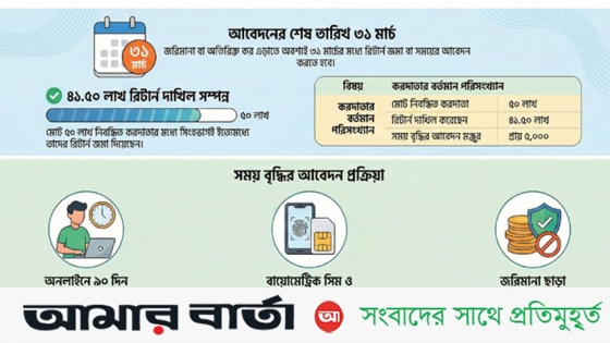চলতি করবর্ষে আয়কর রিটার্ন দেওয়ার জন্য রেজিস্ট্রেশন করা ৫০ লাখ করদাতার মধ্যে ৪১ লাখ ৫০ হাজার করদাতা রিটার্ন দাখিল করেছেন। তবে নির্ধারিত সময়ের মধ্যে যারা আয়কর রিটার্ন দাখিল করতে পারছেন না, তাদের মধ্যে প্রায় পাঁচ হাজার করদাতা সময় বাড়াতে আবেদন করেছেন।
