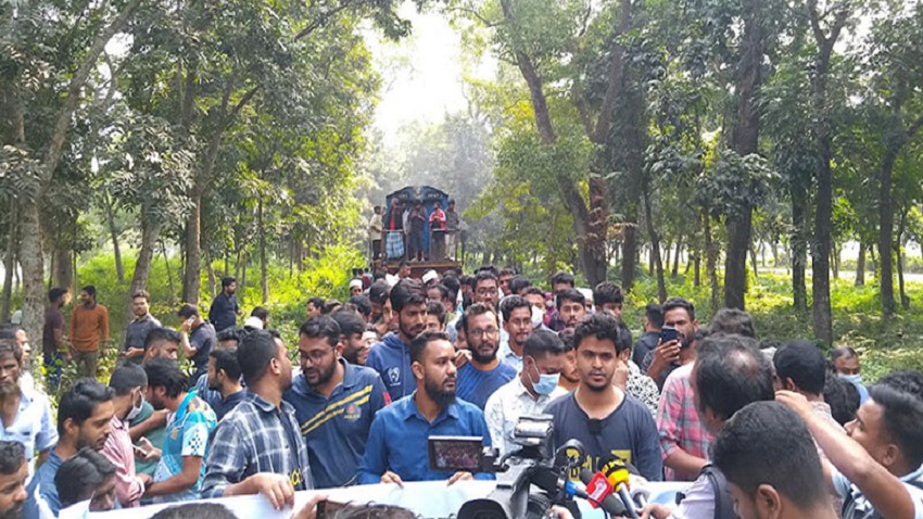 রোববার (২৩ নভেম্বর) সকাল থেকে শিক্ষার্থীরা বিশ্ববিদ্যালয়ের বিভিন্ন হল থেকে ক্ষুদ্র ক্ষুদ্র মিছিল নিয়ে আব্দুল জব্বার মোড়ে রেললাইন সংলগ্ন এলাকায় জড়ো হতে থাকেন। এরপর বেলা ১১টায় রেল অবরোধের কর্মসূচির অংশ হিসেবে ঢাকা থেকে ময়মনসিংহগামী তিস্তা এক্সপ্রেস আটকে দেন। এর ফলে ঢাকা থেকে ময়মনসিংহগামী রেল চলাচল বন্ধ রয়েছে।