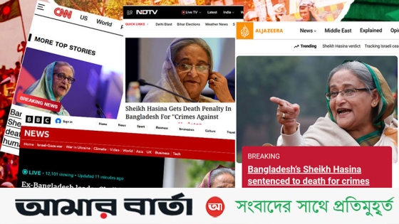 মানবতাবিরোধী শেখ হাসিনার ফাঁসির এ রায়ের খবর বিশ্ব গণমাধ্যমে বেশ গুরুত্বের সঙ্গে প্রচার করা হয়েছে। বিবিসি, আলজাজিরা, সিএনএন, গার্ডিয়ানসহ ভারতীয় সংবাদমাধ্যমগুলোতে এটি ‘প্রধান খবর’ হিসেবে প্রচার করা হচ্ছে।