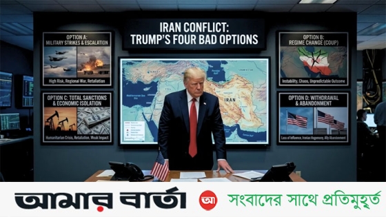 চতুর্থ সপ্তাহে পদার্পণ করা এই যুদ্ধে ট্রাম্পের সামনে এখন চারটি প্রধান পথ খোলা রয়েছে—আলোচনা করা, সামরিক বিজয় ঘোষণা করে সরে আসা, বর্তমান পরিস্থিতি বজায় রাখা অথবা সংঘাতের তীব্রতা বাড়ানো। তবে বিশ্লেষকদের মতে, এই বিকল্পগুলোর প্রতিটিই অত্যন্ত ঝুঁকিপূর্ণ এবং কোনোটিই যুদ্ধের সুনিশ্চিত ও সন্তোষজনক সমাপ্তির গ্যারান্টি দেয় না।