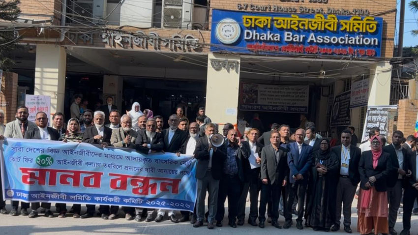 আদালতে বিভিন্ন কাজে কোর্ট ফি'র মাধ্যমে পরিশোধ করা অর্থের ২০ ভাগ আইনজীবী কল্যাণ তহবিলের দেওয়ার দাবিতে মানববন্ধন করেছে ঢাকা আইনজীবী সমিতি।