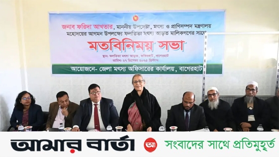 শনিবার (২৭ ডিসেম্বর) সকালে বাগেরহাটের ফকিরহাট উপজেলার ফলতিতা মৎস্য অবতরণ কেন্দ্র পরিদর্শন ও আড়ত মালিকগণের সাথে মতবিনিময় সভায় এসব কথা বলেন তিনি।