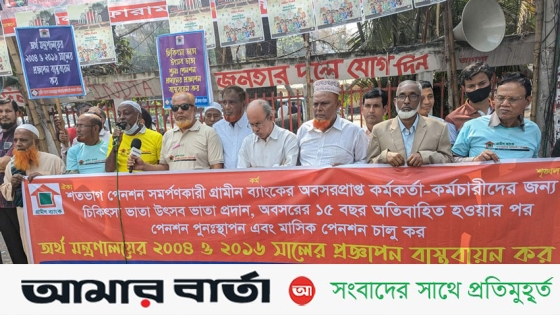 শনিবার (২৮ ফেব্রুয়ারি) জাতীয় প্রেসক্লাবের সামনে গ্রামীণ ব্যাংক অবসরপ্রাপ্ত কর্মকর্তা-কর্মচারী কল্যাণ পরিষদ কর্তৃক আয়োজিত এক মানববন্ধনে এ দাবি জানানো হয়।