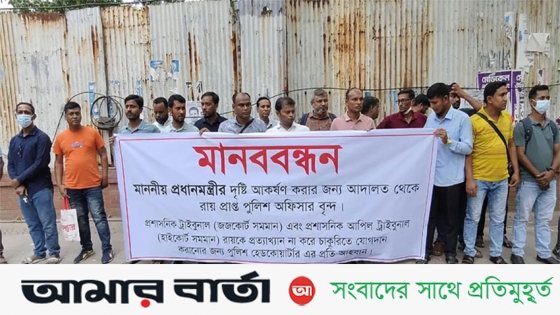 প্রশাসনিক ট্রাইবুনাল ও প্রশাসনিক আপিল ট্রাইবুনাল থেকে রায় পাওয়া চাকরিচ্যুত পুলিশ সদস্যরা পুনর্বহালের দাবিতে মানববন্ধন করেছেন। রোববার (১৯ এপ্রিল) সকালে রাজধানীর পুলিশ সদর দপ্তরের সামনে এই কর্মসূচি অনুষ্ঠিত হয়।