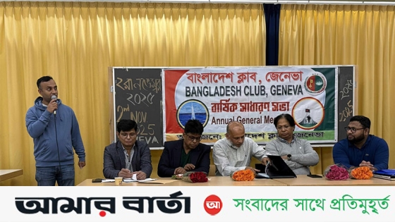 সংগঠনের ত্রিবার্ষিক কার্যনির্বাহী কমিটি গঠন ও বার্ষিক সাধারণ সভা–২০২৫ রোববার (তারিখ) জেনেভার স্থানীয় এক কমিউনিটি হলে উৎসবমুখর পরিবেশে অনুষ্ঠিত হয়। অনুষ্ঠানে সভাপতিত্ব করেন বিদায়ী সভাপতি হারুন রশিদ এবং পরিচালনা করেন সাধারণ সম্পাদক নুরুল ইসলাম।