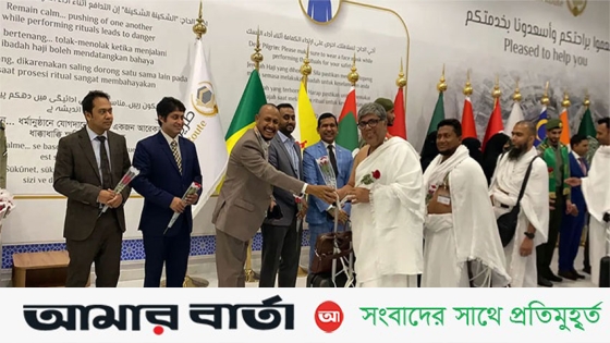 হজযাত্রীদেরকে ফুল দিয়ে শুভেচ্ছা জানানো হয় এবং তাদের হাতে রিফ্রেশমেন্ট কিট তুলে দেওয়া হয়।