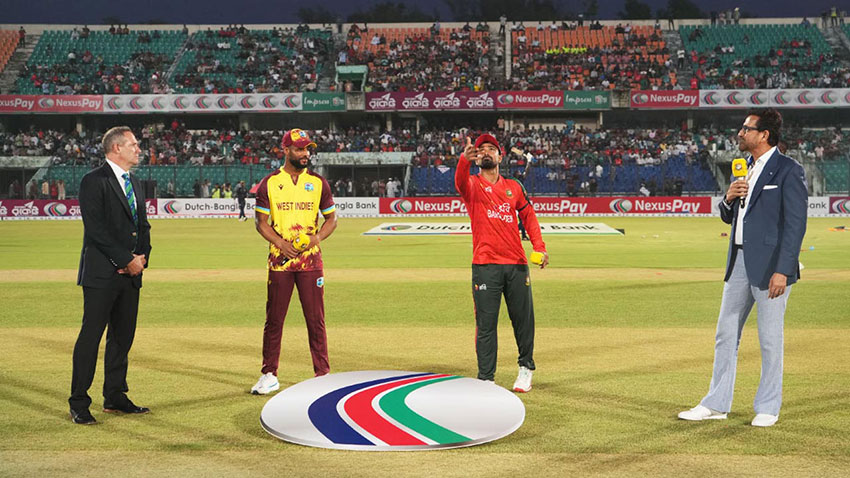 সিরিজের প্রথম টি-টোয়েন্টিতে টস জিতে আগে ব্যাট করার সিদ্ধান্ত নিয়েছেন ওয়েস্ট ইন্ডিজ অধিনায়ক শাই হোপ। ম্যাচটি শুরু হবে বাংলাদেশ সময় সন্ধ্যা ৬টায়।