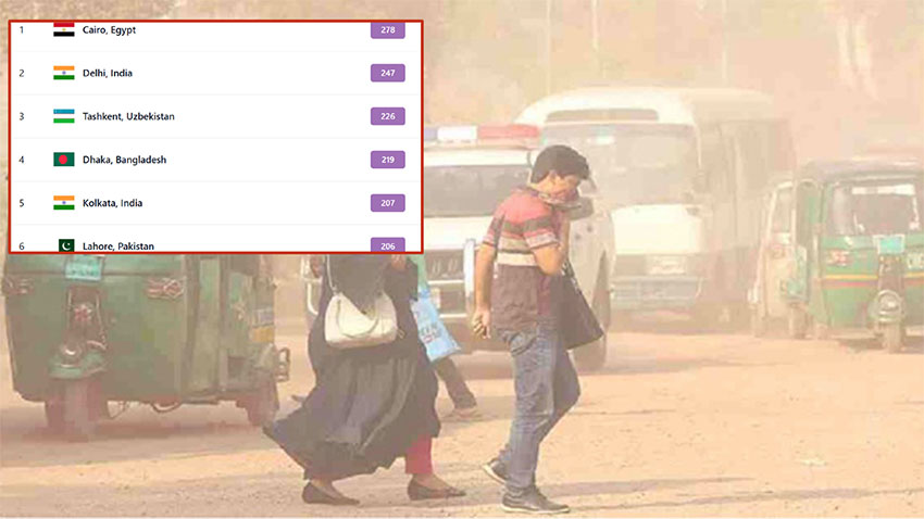 বায়ুদূষণে বিশ্বের শহরগুলোর তালিকায় আজ প্রথম স্থানে রয়েছে মিসরের কায়রো, যার স্কোর ২৭৮, দ্বিতীয় অবস্থানে রয়েছে ভারতের দিল্লি, স্কোর ২৪৭, তৃতীয় অবস্থানে রয়েছে উজবেকিস্তানের তাশকেন্ট, স্কোর ২২৬ এবং পঞ্চম স্থানে রয়েছে ভারতের কলকাতা, স্কোর ২০৭।