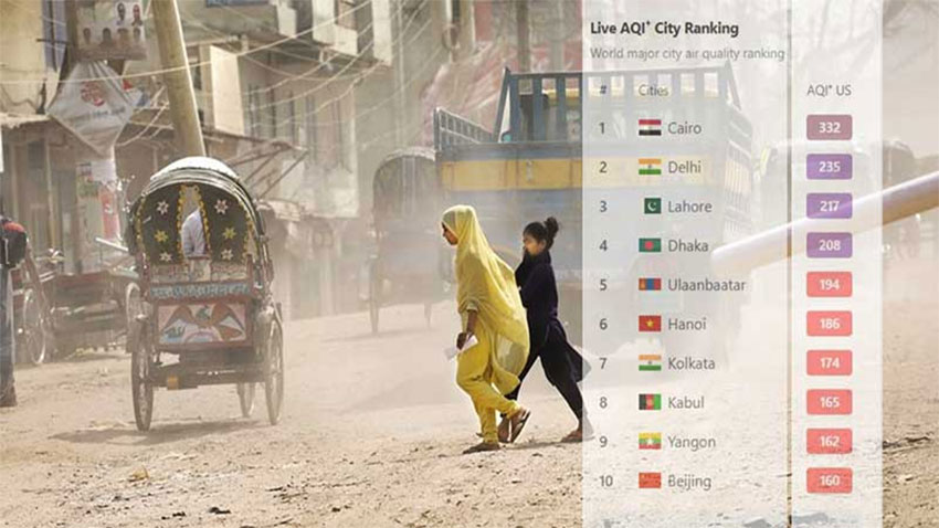 শীর্ষে থাকা অন্যান্য শহর তালিকার তথ্যমতে, ৩৩২ স্কোর নিয়ে আজ দূষণের শীর্ষে অবস্থান করছে মিশরের কায়রো। ভারতের রাজধানী দিল্লি ২৩৫ স্কোর নিয়ে রয়েছে দ্বিতীয় অবস্থানে। তৃতীয় অবস্থানে থাকা পাকিস্তানের লাহোরের স্কোর ২১৭। এছাড়া ভারতের আরেক শহর কলকাতা ১৭৪ স্কোর নিয়ে রয়েছে সপ্তম অবস্থানে। তালিকার শীর্ষ চারটি শহরের বায়ুমানই ‘খুব অস্বাস্থ্যকর’ পর্যায়ে রয়েছে।