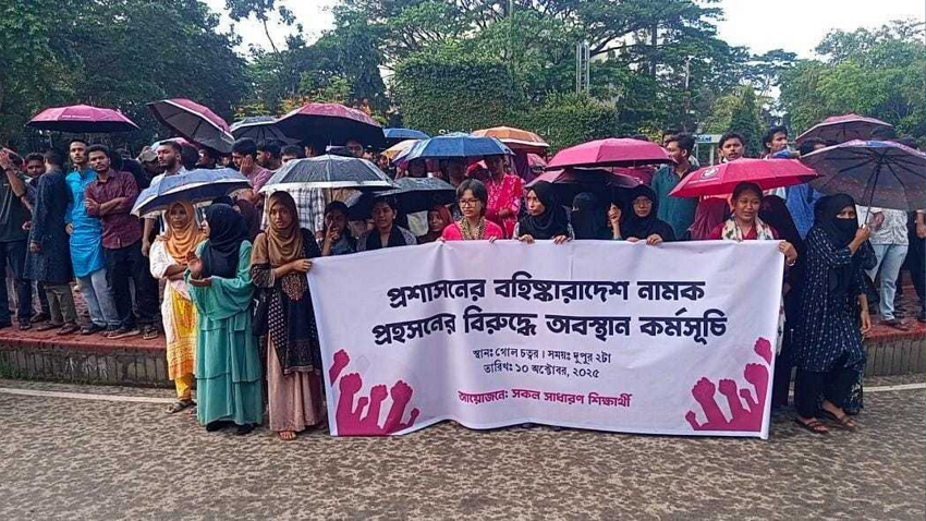 শুক্রবার (১০ অক্টোবর) দুপুরে বিশ্ববিদ্যালয়ের গোলচত্বরে বৃষ্টি উপেক্ষা করে এই কর্মসূচি পালন করেন তারা। এতে বিভিন্ন বিভাগের প্রায় শতাধিক শিক্ষার্থী অংশ নেন।