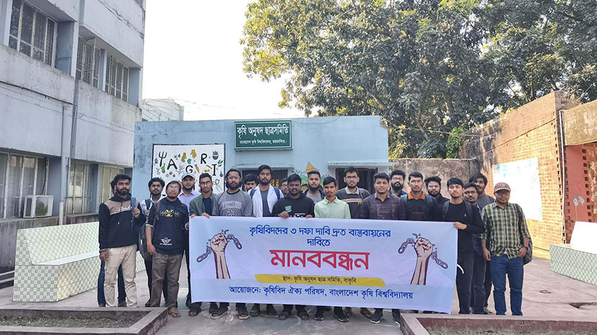 কৃষিবিদদের তিন দফা দাবি দ্রুত বাস্তবায়নের দাবিতে মানববন্ধন করেছে বাংলাদেশ কৃষি বিশ্ববিদ্যালয়ের (বাকৃবি) কৃষি অনুষদের শিক্ষার্থীরা।