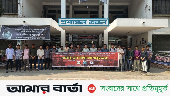 শনিবার (২৫ এপ্রিল) দুপুর ২ টায় বিশ্ববিদ্যালয়ের প্রশাসন ভবনের সামনে এই মানববন্ধন অনুষ্ঠিত হয়।