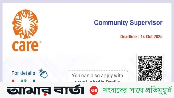 আন্তর্জাতিক সাহায্যকারী সংস্থা কেয়ার বাংলাদেশে ‘কমিউনিটি সুপারভাইজার’ পদে জনবল নিয়োগ দেওয়া হবে। আগ্রহীরা আগামী ১৪ অক্টোবর পর্যন্ত আবেদন করতে পারবেন।