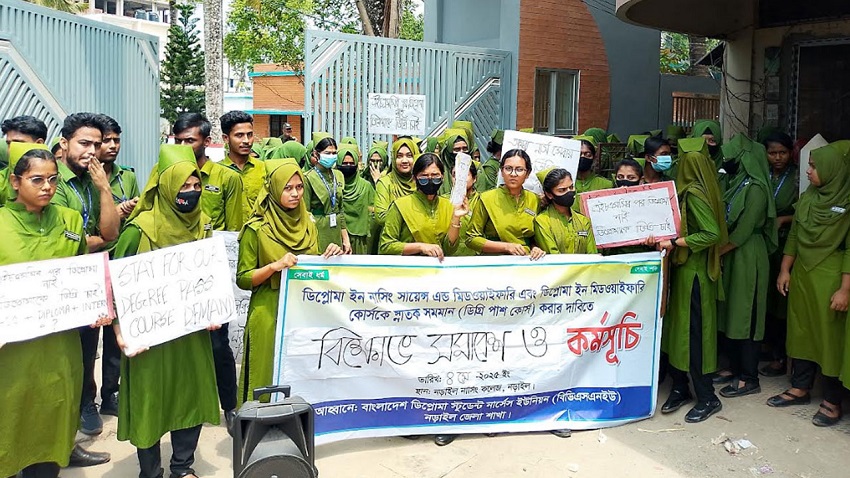 ডিপ্লোমা ইন নার্সিং সায়েন্স অ্যান্ড মিডওয়াইফারি এবং ডিপ্লোমা ইন মিডওয়াইফারি কোর্স দুটির সনদের মান স্নাতকের (পাস) সমান করার দাবিতে মানববন্ধন ও বিক্ষোভ কর্মসূচি পালন করছেন নড়াইল নার্সিং কলেজের শিক্ষার্থীরা।