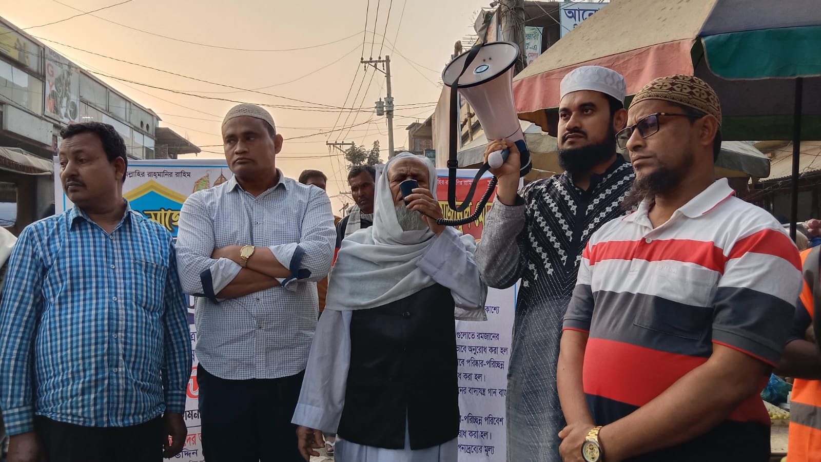 বুধবার বিকেলে বাজার এলাকার ঐতিহ্যবাহী স্থানে আয়োজন করা এই কর্মসূচিতে ব্যবসায়ী ও স্থানীয় মানুষদের মধ্যে রমজানের তাৎপর্য তুলে ধরা হয়। বক্তারা রমজানের মাসে সংযম, ভ্রাতৃত্ববোধ ও মানবিক মূল্যবোধের গুরুত্বে আলোকপাত করেন এবং সকলকে ন্যায্যমূল্যে পণ্য বিক্রয় ও ধর্মীয় অনুভূতির প্রতি শ্রদ্ধাশীল হওয়ার আহ্বান জানান।