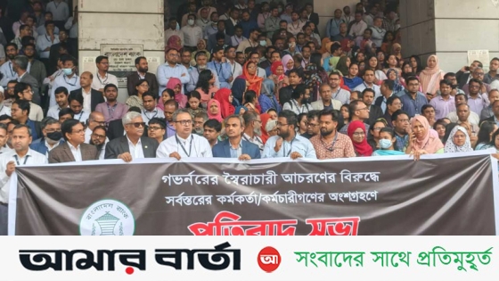 মাসুম বিল্লাহ বলেন, গভর্নর বিভিন্ন স্বৈরাচারী পদক্ষেপ নিয়েছে, তার তীব্র নিন্দা জানাই। আমাদের তিনজনকে শোকজ নোটিশ দিয়েছে; এর জবাব দেওয়ার আগেই বদলি করা হয়েছে। আমরা বিষয়টি সমাধানের জন্য ওনার কাছে গেলেও দেখা করেন না। তাই আমরা আমাদের শোকজ নোটিশ ও বদলি প্রত্যাহারসহ অন্যান্য দাবি-দাওয়া আজকের মধ্যে বাস্তবায়নের দাবি জানাচ্ছি। যদি তা বাস্তবায়ন না করা হয় তাহলে আগামীকাল থেকে প্রতীকী কলম বিরতিতে যাবো। আর রোববার সর্বস্থরের কর্মকর্তাদের আলোচনা করে পরবর্তী কর্মসূচি ঘোষণা করা হবে।