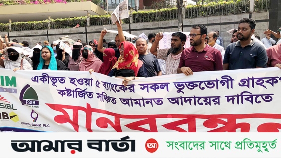 বৃহস্পতিবার সকাল থেকে গ্রাহকেরা বাংলাদেশ ব্যাংকের সামনে মানববন্ধন শুরু করে।