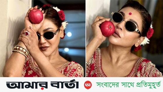 শেয়ার করা ছবিতে দেখা যায়, কপালে লাল টিপ, মাথার খোঁপায় লাল-সাদা গোলাপ এবং চোখে স্টাইলিশ রোদচশমা তাকে দিয়েছে এক দারুণ আভিজাত্যপূর্ণ লুক। হাতে পরেছিলেন পাথরের তৈরি চুড়ি ও বালা। তবে এই পুরো লুকের সবচেয়ে বড় চমক ছিল তার হাতে থাকা একটি টুকটুকে লাল আপেল।