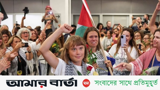 সুইডিশ জলবায়ু আন্দোলনকর্মী গ্রেটা থুনবার্গ ইসরায়েলি বাহিনীর আটক অবস্থা থেকে মুক্তি পেয়ে গ্রিসের এথেন্স বিমানবন্দরে পৌঁছালে ফিলিস্তিনপন্থি উল্লসিত জনতা তাকে ফুল দিয়ে বরণ করে নেয়।