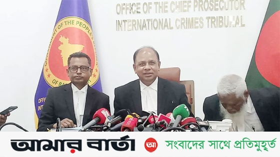 সংবাদ সম্মেলনে আন্তর্জাতিক অপরাধ ট্রাইব্যুনালের চিফ প্রসিকিউটর আমিনুল ইসলাম।
