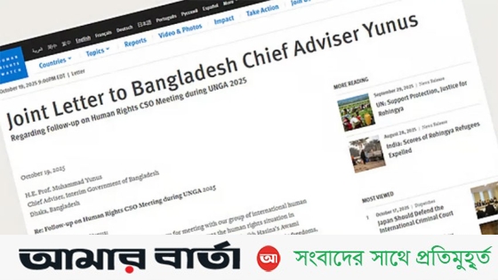 রোববার (২০ অক্টোবর) অন্তর্বর্তী সরকারের প্রধান উপদেষ্টা ড. মুহাম্মদ ইউনূসের উদ্দেশে লেখা খোলা চিঠিটি এইচআরডব্লিউ’র ওয়েবসাইটে প্রকাশ করা হয়েছে।
