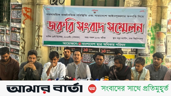সোমবার (১৫ ডিসেম্বর) ঢাকা বিশ্ববিদ্যালয়ের (ঢাবি) মধুর ক্যান্টিন প্রাঙ্গণে বিরাজমান রাজনৈতিক পরিস্থিতি ও সারা দেশের আইনশৃঙ্খলা পরিস্থিতি নিয়ে আয়োজিত এক জরুরি সংবাদ সম্মেলনে এ দাবি জানান সংগঠনটির নেতারা।