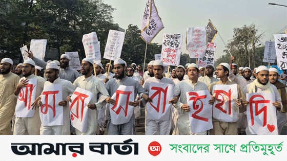 আজ শনিবার (২০ ডিসেম্বর) সকাল সাড়ে ১০টায় সরেজমিনে দেখা যায়, মিছিল থেকে ‘আমরা সবাই হাদি হবো যুগে যুগে লড়ে যাবো’, ‘হাদি ভাইয়ের রক্ত বৃথা যেতে দেব না’, ইত্যাদি স্লোগান দেওয়া হচ্ছে।