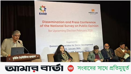 বেসরকারি সংস্থা এমিনেন্স অ্যাসোসিয়েটস ফর সোশ্যাল ডেভেলপমেন্ট (ইএএসডি) এই জনমত জরিপ চালায়। সোমবার (০৫ জানুয়ারি) বিকেলে রাজধানীর ফার্মগেটে কেআইবি মিলনায়তনে জরিপের ফলাফল তুলে ধরেন ইএএসডির প্রধান নির্বাহী কর্মকর্তা শামীম হায়দার তালুকদার।
