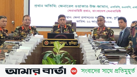 বৃহস্পতিবার (২২ জানুয়ারি) কুমিল্লা জেলা প্রশাসকের সম্মেলন কক্ষে সেনাবাহিনী প্রধান মোতায়েনকৃত সেনাসদস্যদের কার্যক্রম সরেজমিনে পর্যবেক্ষণ ও প্রয়োজনীয় দিকনির্দেশনা প্রদান এবং বেসামরিক প্রশাসনের সাথে মতবিনিময় করেন।