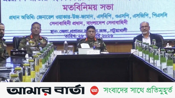 পটুয়াখালী জেলা প্রশাসকের সম্মেলন কক্ষে আয়োজিত এক মতবিনিময় সভায় সেনাপ্রধান ঊর্ধ্বতন সামরিক কর্মকর্তা, বিভাগীয় ও জেলা প্রশাসনের প্রতিনিধি এবং বিভিন্ন আইনশৃঙ্খলা রক্ষাকারী বাহিনীর কর্মকর্তাদের সঙ্গে নির্বাচনকেন্দ্রিক সার্বিক প্রস্তুতি নিয়ে আলোচনা করেন। সভায় শান্তিপূর্ণ ও সুষ্ঠু নির্বাচন আয়োজনের লক্ষ্যে মাঠপর্যায়ের চ্যালেঞ্জ, নিরাপত্তা ব্যবস্থাপনা এবং দায়িত্ব পালনে সমন্বিত উদ্যোগের ওপর গুরুত্ব দেওয়া হয়।