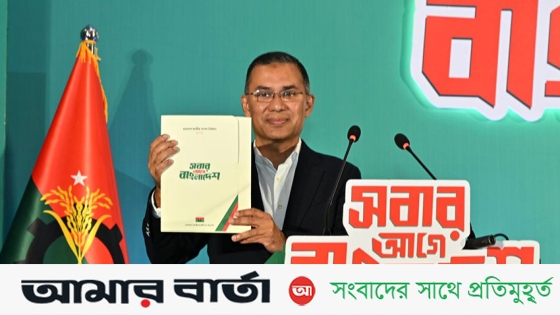 আসন্ন ত্রয়োদশ জাতীয় সংসদ নির্বাচন সামনে রেখে ইশতেহার ঘোষণা করেছে বাংলাদেশ জাতীয়তাবাদী দল (বিএনপি)। শুক্রবার (৬ ফেব্রুয়ারি) বিকেলে রাজধানীর সোনারগাঁও হোটেলে ‘সবার আগে বাংলাদেশ’ স্লোগানে ত্রয়োদশ জাতীয় সংসদ নির্বাচন উপলক্ষে ঘোষিত বিএনপির নির্বাচনী ইশতেহার ঘোষণা করেন দলটির চেয়ারম্যান তারেক রহমান।