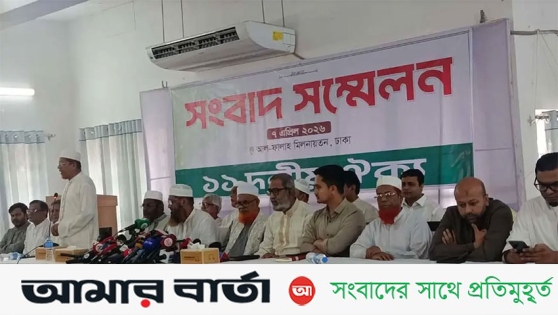 জরুরি বৈঠক শেষে মঙ্গলবার (৭ এপ্রিল) দুপুর সাড়ে ১২টায় মগবাজার আল-ফালাহ মিলনায়তনে ১১ দলীয় ঐক্য আয়োজিত সংবাদ সম্মেলনে একর্মসূচি ঘোষণা করেন বাংলাদেশ খেলাফত মজলিশের আমির মাওলানা মামুনুল হক।