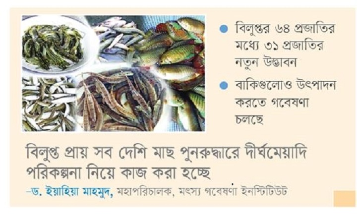 বাংলাদেশ মৎস্য গবেষণা ইনস্টিটিউটের (বিএফআরআই) বিজ্ঞানীরা বিলুপ্তপ্রায় সকল দেশীয় মাছ খাবার টেবিলে আনতে ক্লান্তিহীন গবেষণা চালিয়ে যাচ্ছেন। কৃত্রিম প্রজননের মাধ্যমে ইতোমধ্যে ৩১ প্রজাতির দেশীয় মাছের পোনা উৎপাদনে সফল হয়েছেন।