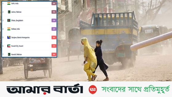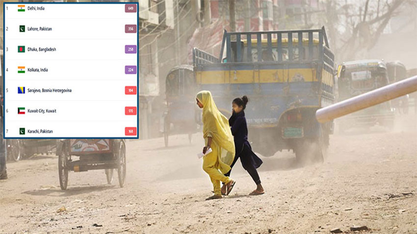বায়ুদূষণে বিশ্বের শহরগুলোর তালিকায় আজ প্রথম স্থানে রয়েছে ভারতের নয়া দিল্লি, স্কোর ৬৪৯, দ্বিতীয় অবস্থানে রয়েছে পাকিস্তানের লাহোর, স্কোর ৩৫৬, চতুর্থ স্থানে রয়েছে ভারতের কলকাতা, যার স্কোর ২২৪, পঞ্চম স্থানে রয়েছে বসনিয়ার সারাজেভো, স্কোর ১৮৪।