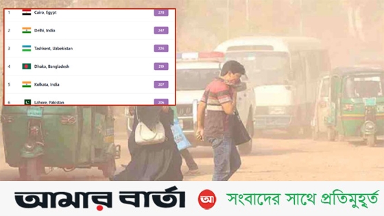 বায়ুদূষণের তালিকায় বিশ্বে তিন নম্বরে রয়েছে বাংলাদেশের রাজধানী ঢাকা। বাতাসের মান সূচকে ঢাকার বায়ুর স্কোর ২১৯। যা ‘খুবই অস্বাস্থ্যকর’ বলে বিবেচিত।