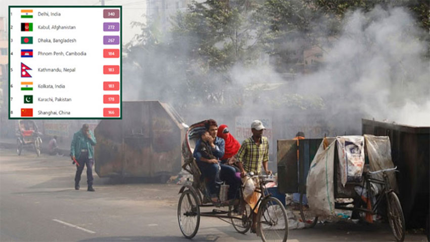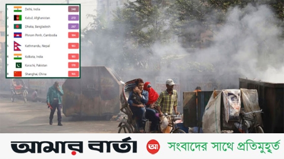 সারা বিশ্বের মধ্যে সবচেয়ে দূষিত বাতাসের শহরের তালিকায় শীর্ষে উঠে এসেছে ভারতের দিল্লি, স্কোর ৩৪০। আর এ তালিকায় তৃতীয় অবস্থানে রয়েছে বাংলাদেশের রাজধানী ঢাকা, যার স্কোর ২৬৭, যা ‘খুবই অস্বাস্থ্যকর’ বলে বিবেচিত।